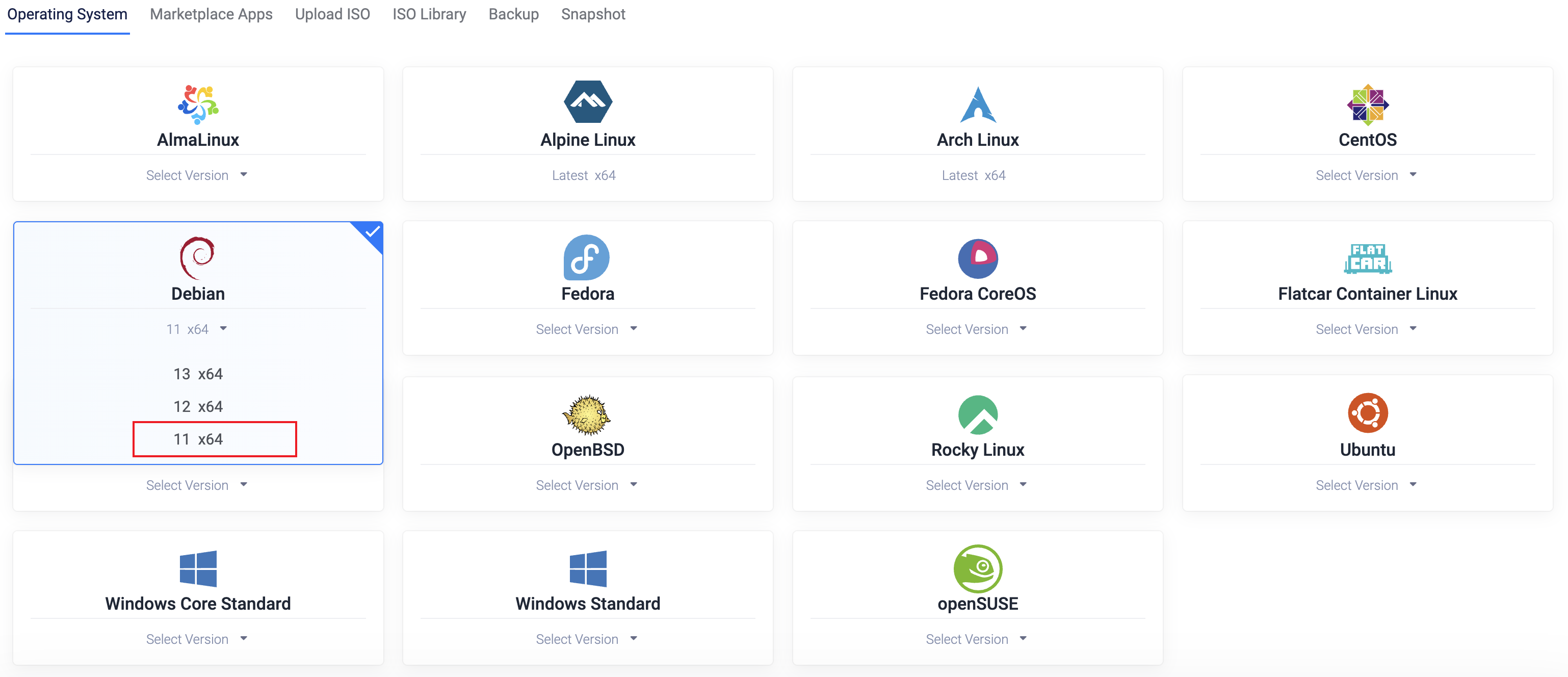 第三步:接下来要注意了,系统最好选择Debian 11 x64,点击Debian可以下拉选择11 x64